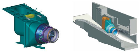 The pit turbine, which is a variation of the bulb turbine, also finds its application in the head range of 1.5 to 10 m unit capacity below 15MW. The generator (with a speed-increasing gearbox) is contained within the upstream pit. Its efficiency is better than S-type tubular turbine unit and its cost is lower than bulb tubular unit. The pit configuration has the advantage of easy access to all the equipment components, in particular the coupling of turbine and speed increaser, the speed increaser itself and the generator. This facilitates inspection, maintenance and repair.